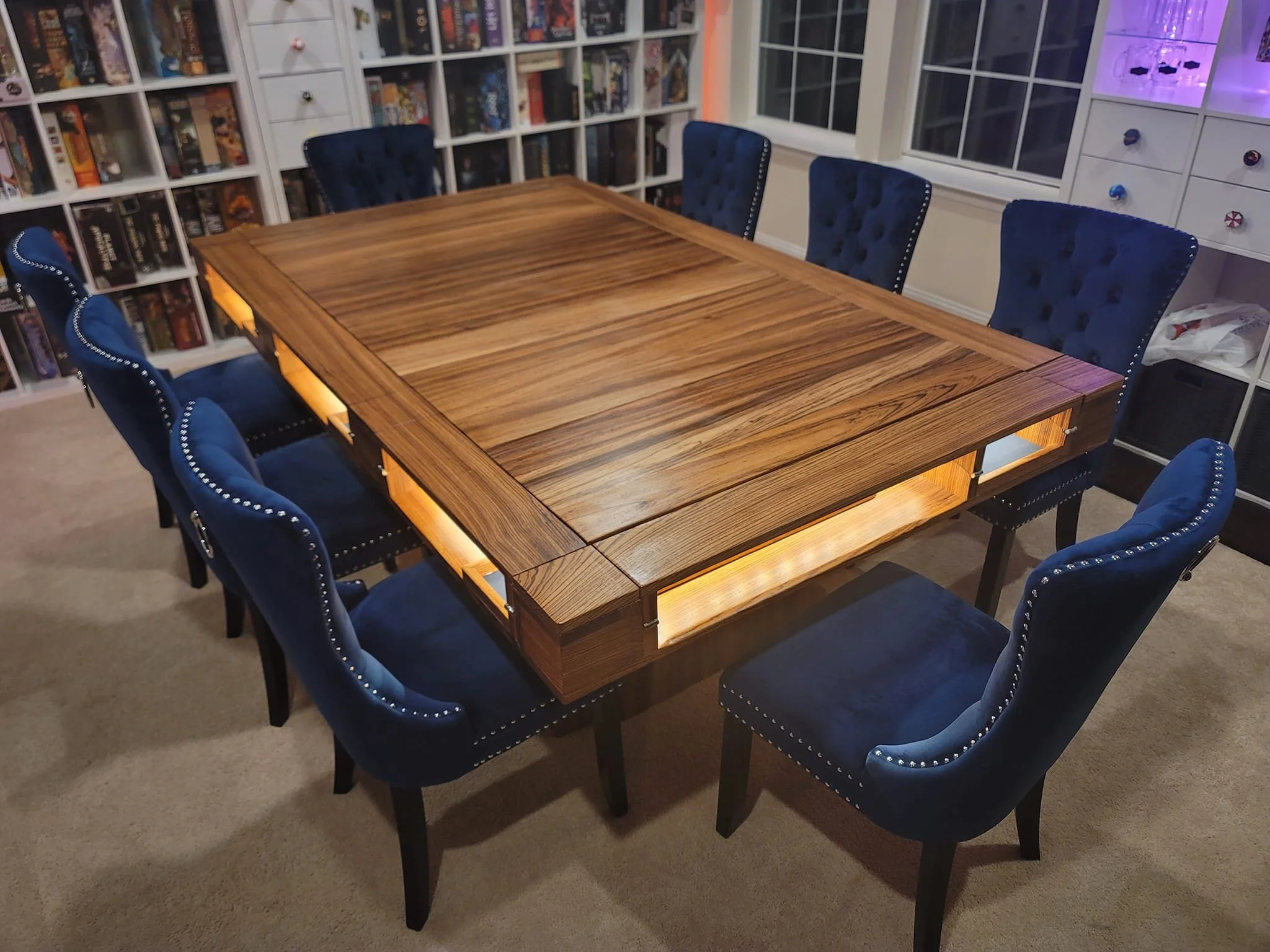 Integrated lighting can create the perfect ambiance or improve visibility for late-night games. For a truly immersive experience, we can install TV screens or monitors directly into the table, allowing you to display game stats, maps, or even stream content.