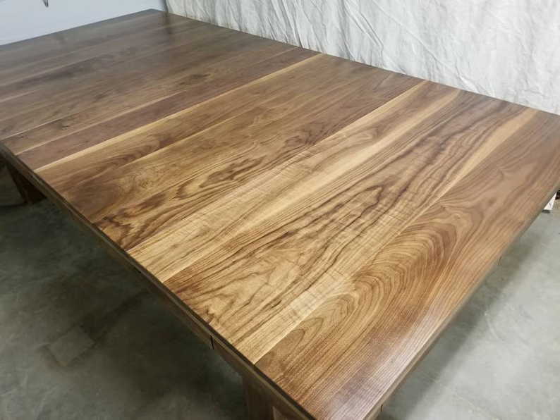 This table is 5 ft. by 10 ft., but it can be made in different sizes. The finished height is just shy of 33 in, which could also be adjusted. This table is natural walnut with no stain on it. Handle, hinge, and felt color are customizable. This table will only be offered in walnut or cherry due to its design. Other woods would make it unbelievably heavy.